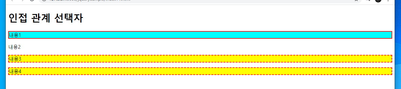 형 요소 선택자는 선택한 요소를 기준으로 바로 이전 형제 요소만 선택한다. 그리고 동생 요소 선택자는 선택한 요소를 기준으로 바로 다음 형제만 선택한다.