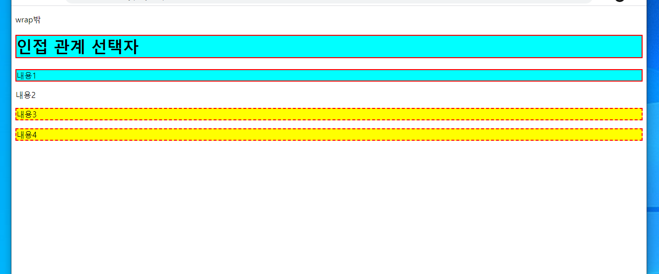 전체 형 요소 선택자는 선택한 요소를 기준으로 이전에 오는 전체 형제 요소를 선택한다. 그리고 전체 동생 요소 선택자는 선택한 요소를 기준으로 다음에 오는 전체 형제 요소를 선택한다.