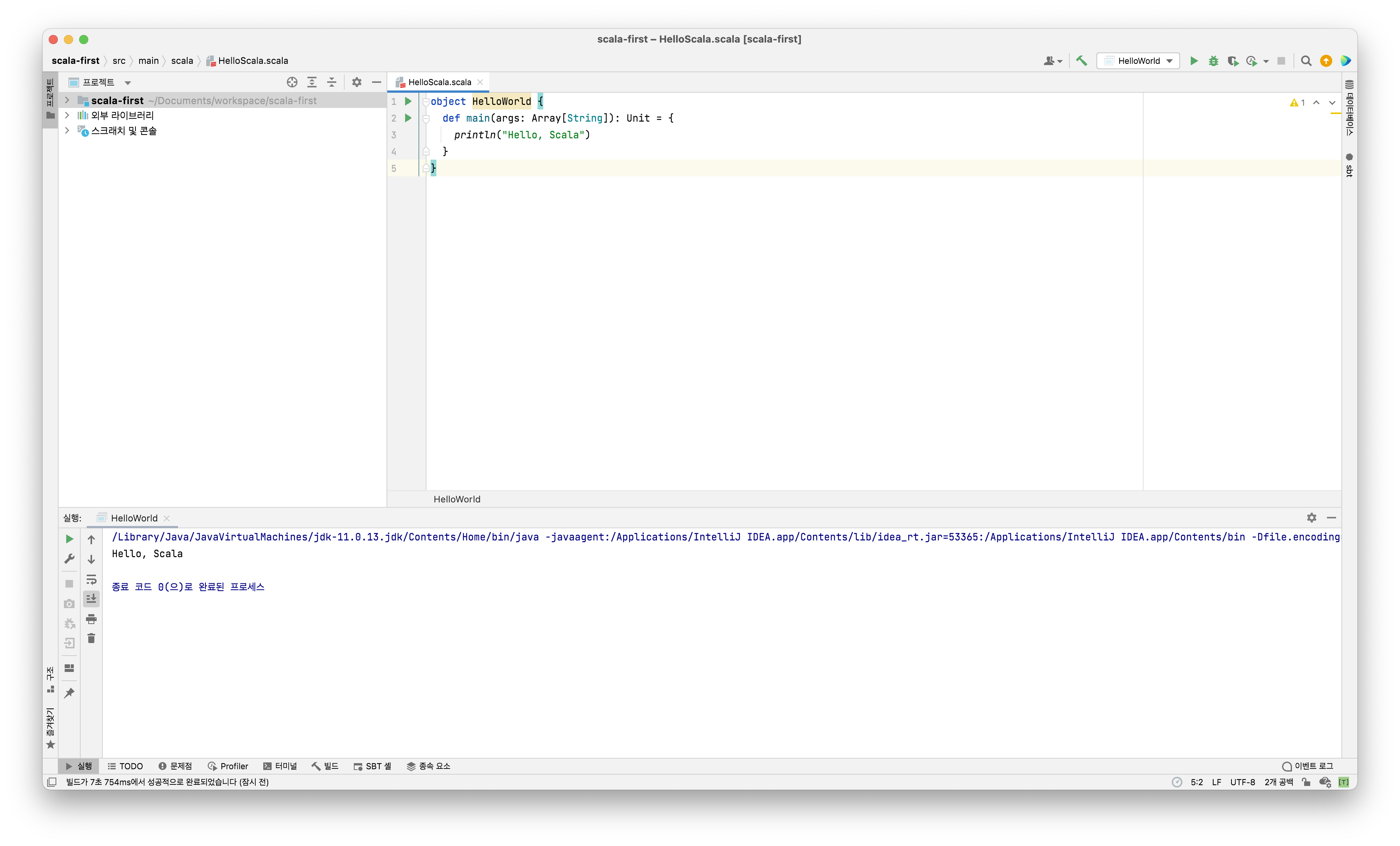 인텔리제이에서의 스칼라(컴파일러)와 터미널에서의 스칼라(인터프리터) 설치가 각각 개별인듯 하다..