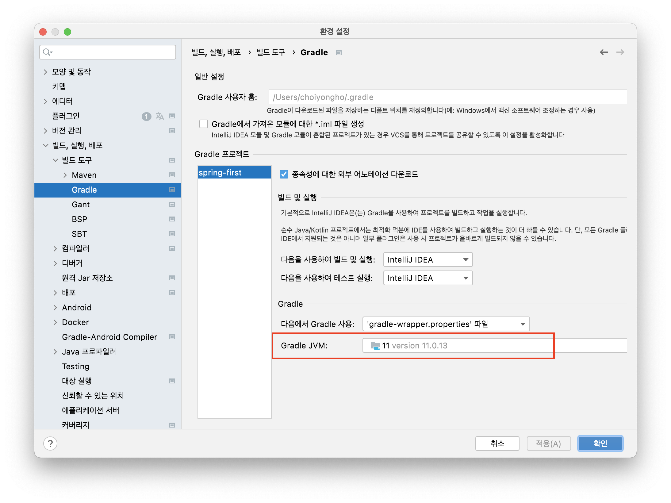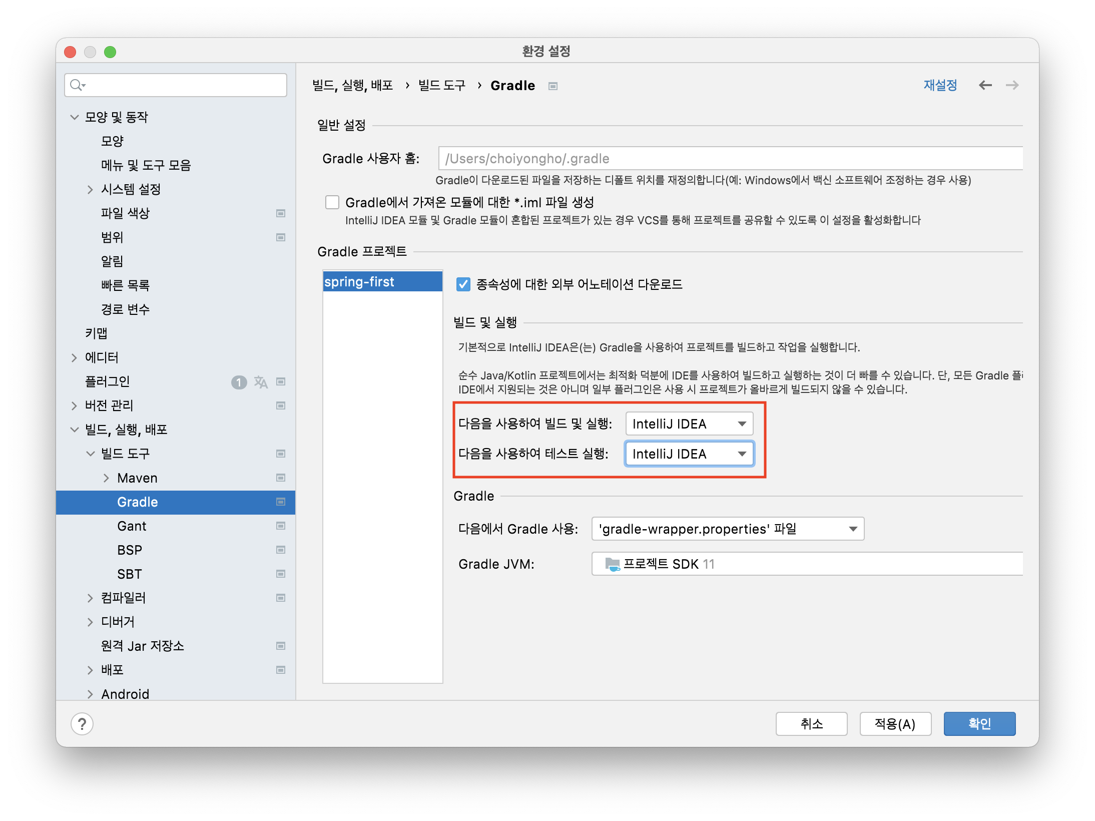 환경설정 -> 빌드, 실행, 배포 -> 빌드 도구 -> Gradle