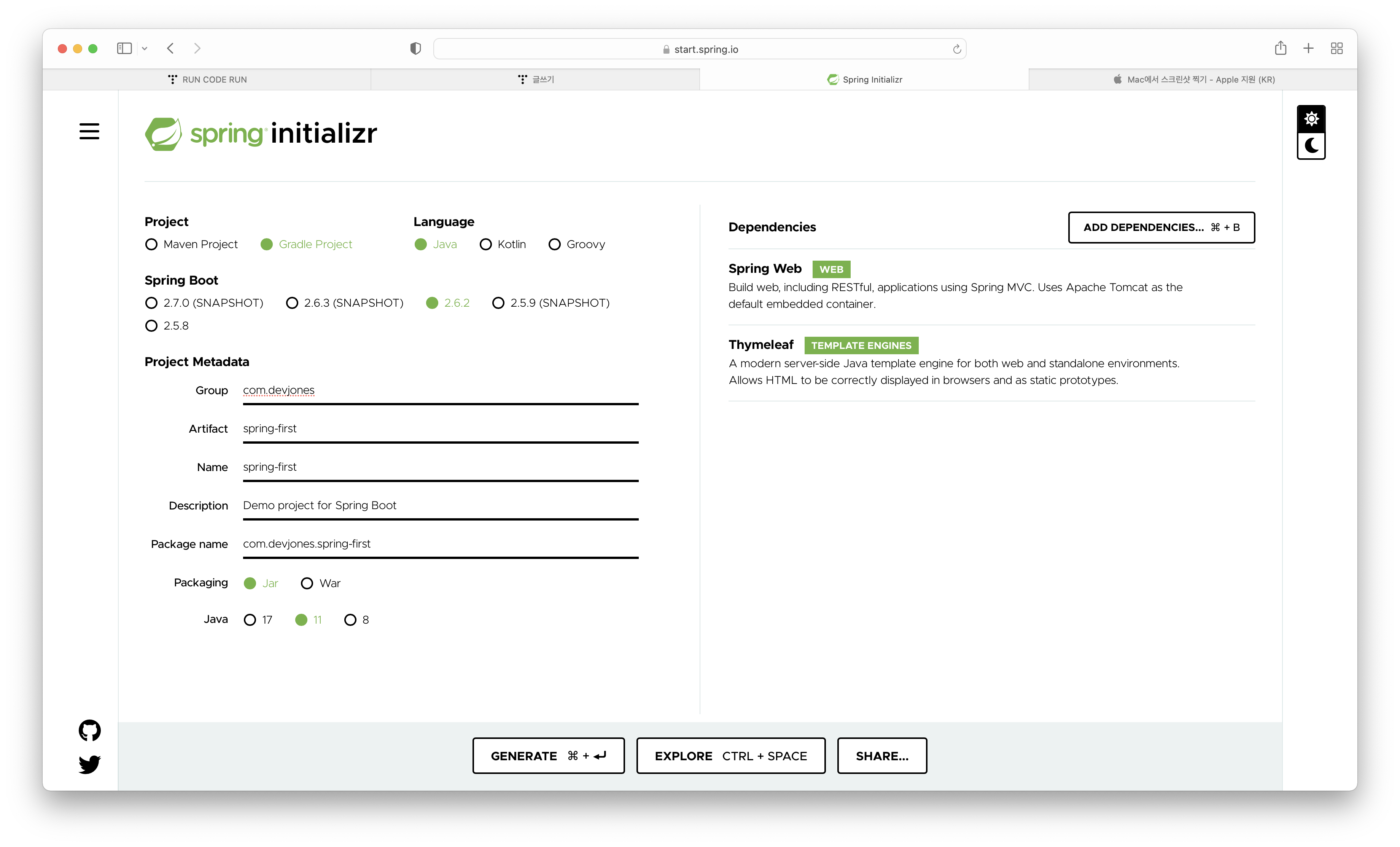 오른쪽의 Dependencies의 경우 일단은 Spring web, Thymeleaf 두개만 받았다.
