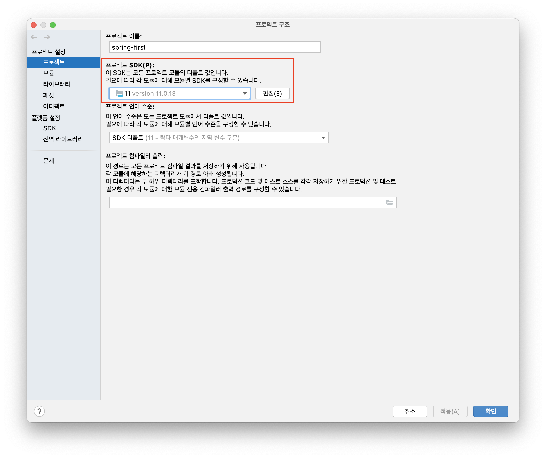 또한 (⌘ ;) 를 눌러 JDK 설정을 확인할 수 있다.