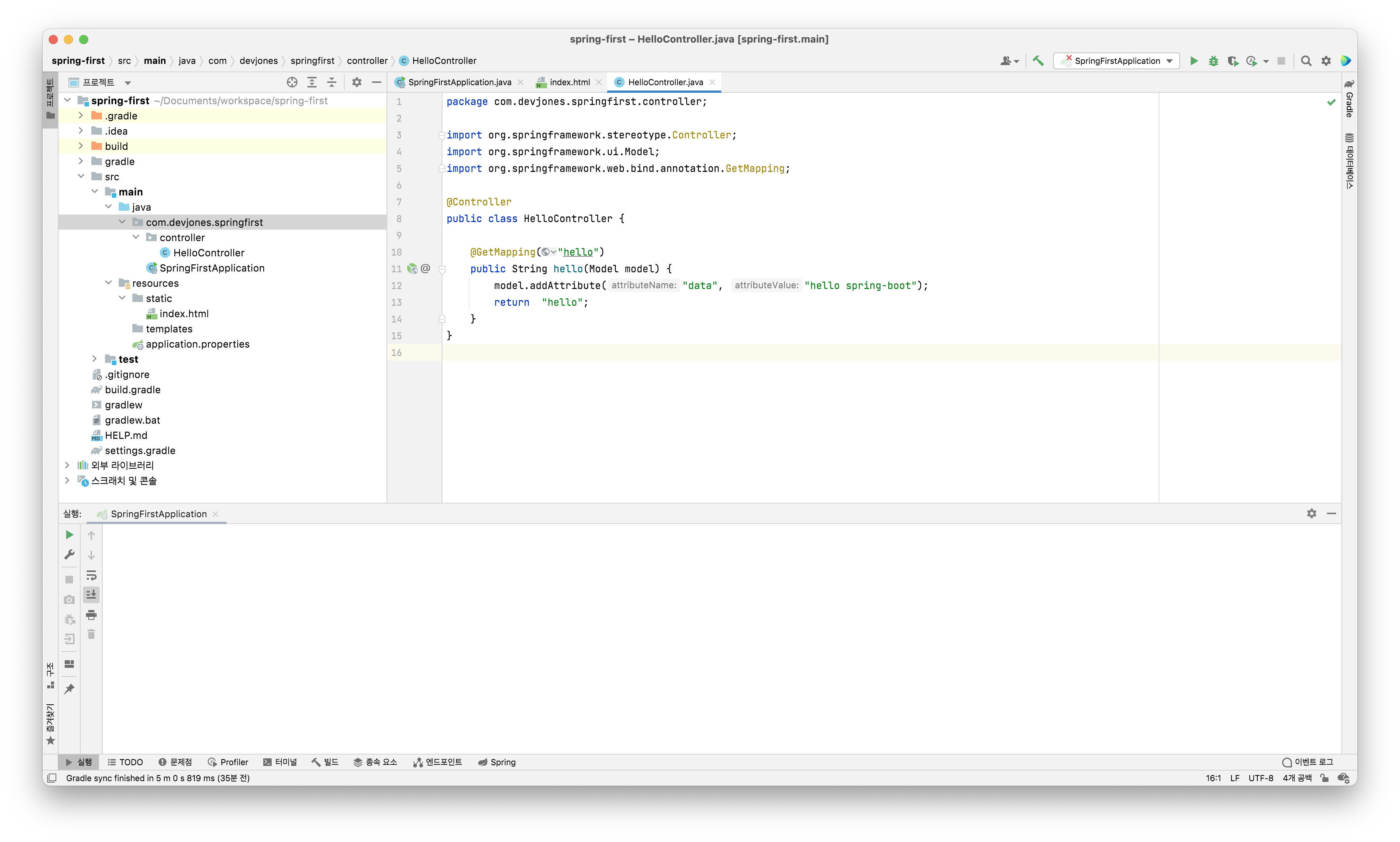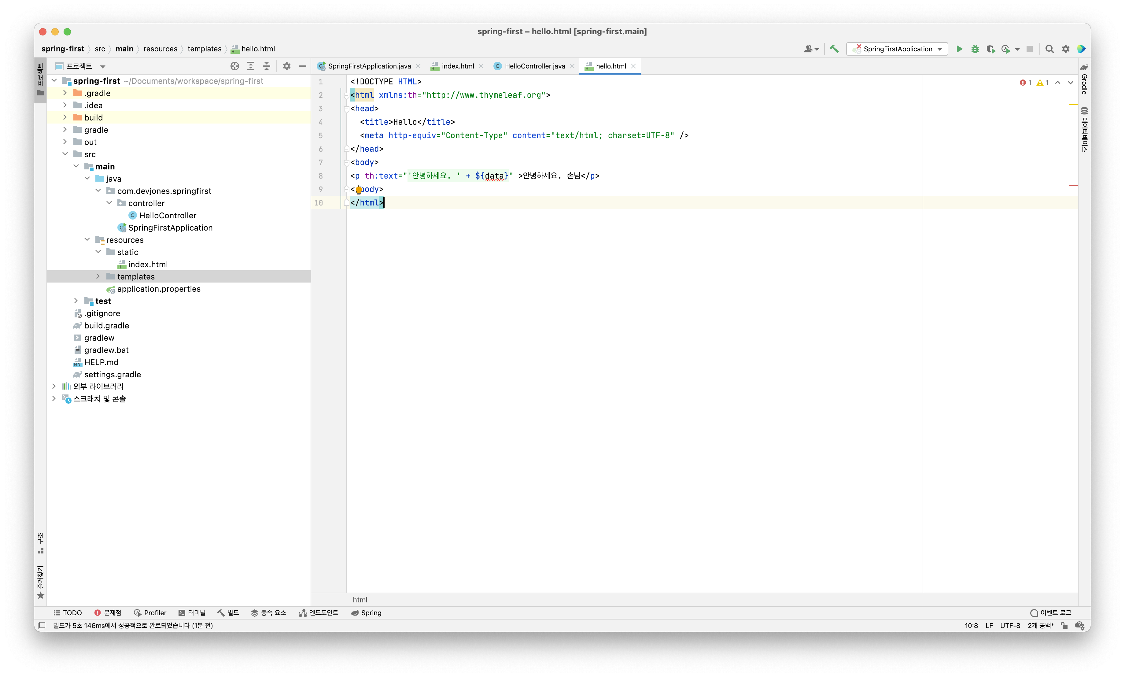 그리고 resources/templates/ 경로에 hello.html 파일을 만든다.