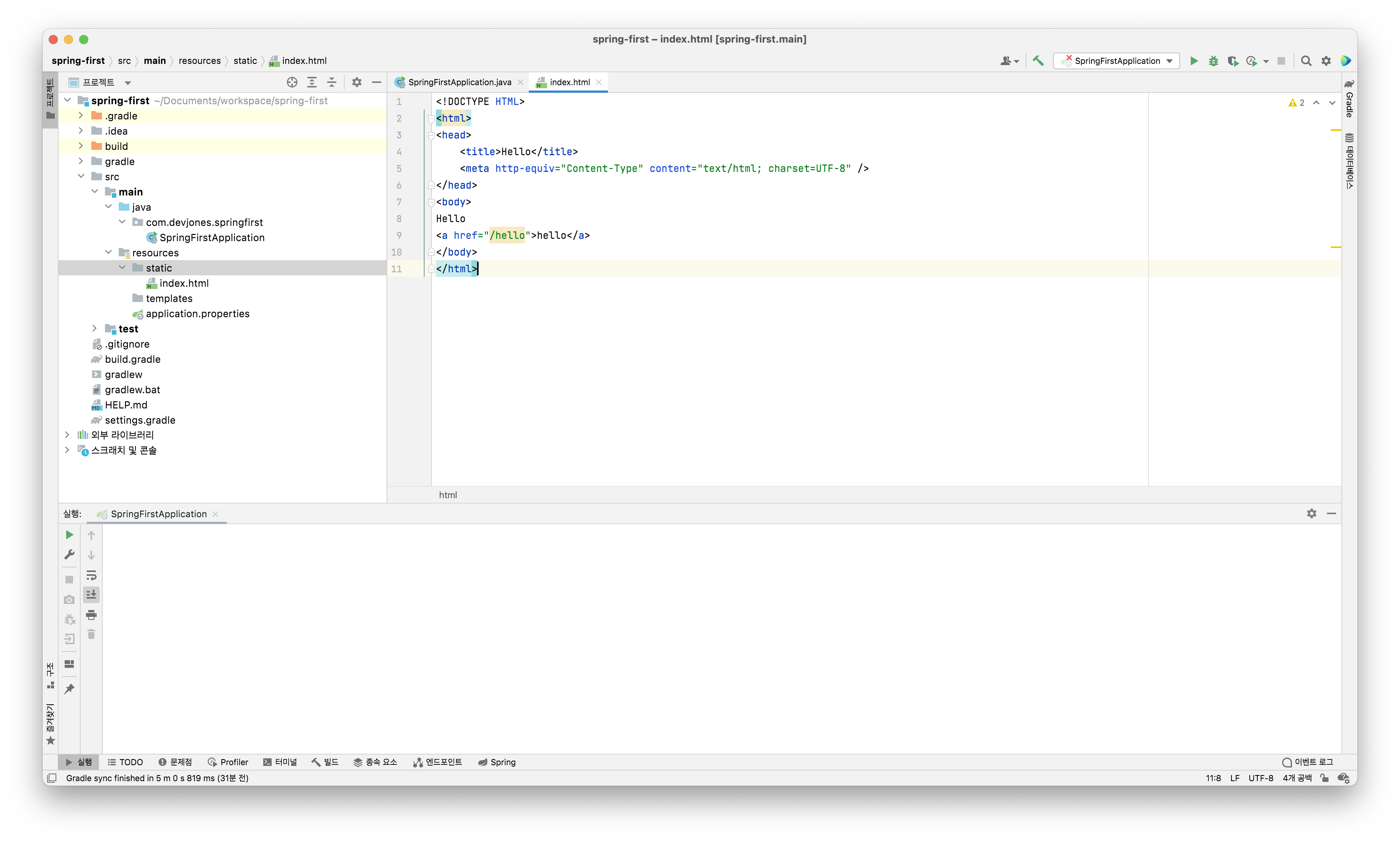프로젝트의 resources/static 폴더에 index.html을 작성한다.