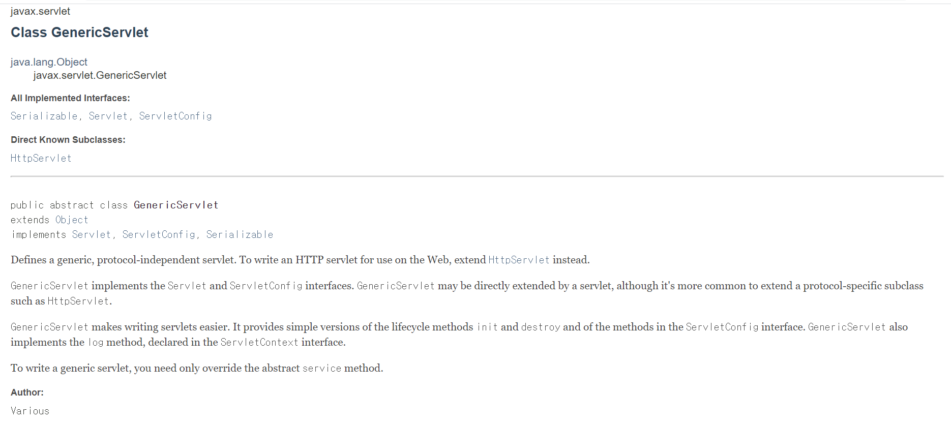 Servlet 인터페이스를 구현하는 제네릭서블릿이다. 그리고 마침내 이 클래스를 상속하는 HttpServlet도 알아보려한다.