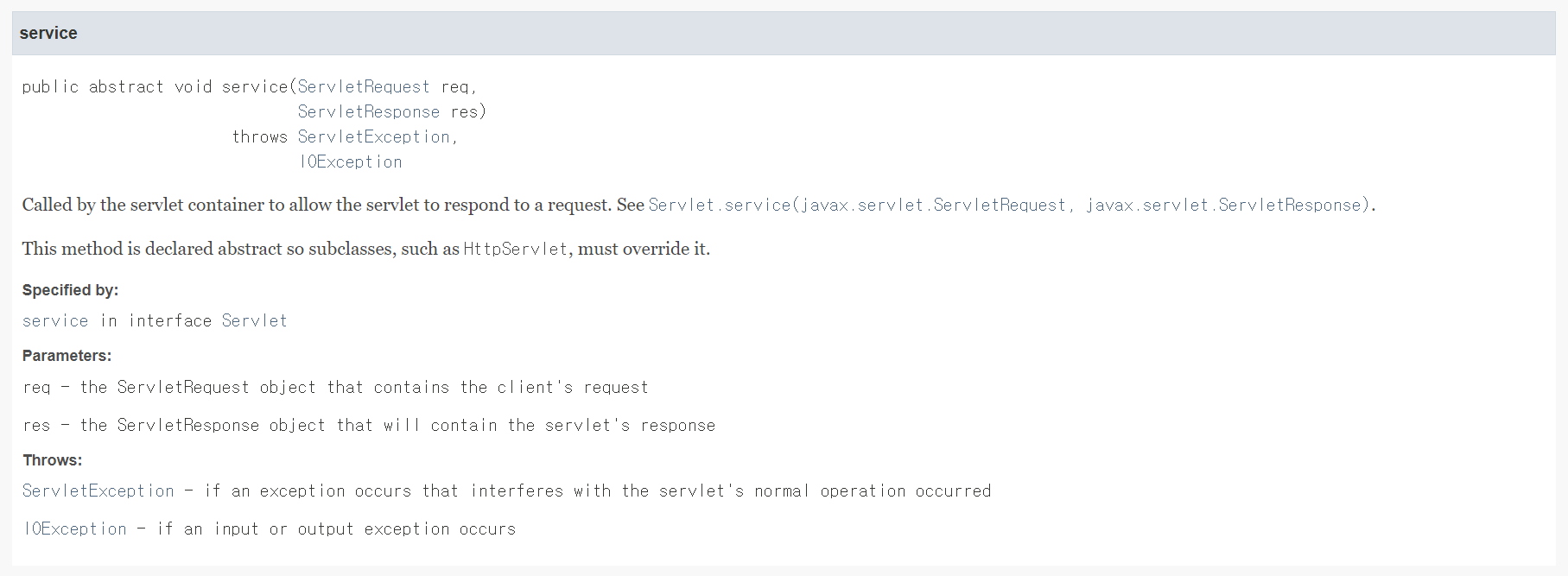 기본적으로 Servlet 인터페이스를 구현한다. 그러니까 인터페이스에 작성된 내용을 무조건 구현해야하는데, service 메소드가 주목해볼만해서 가져왔다.